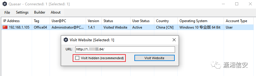 这里我用的QuasarRAT开源远控进行测试,通过“Sent to Website”功能使用他们主机的默认浏览器访问反代地址或webrtc地址,但需要将“隐藏访问”选项取消勾选。