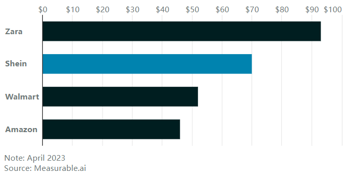 Kearney合伙人兼零售业行业分析师布莱恩·埃利格(Brian Ehrig)认为,不管商业模式是否有不同之处,消费者的支出都是有限的,他们在Shein消费1美元,传统零售商就会失去1美元收入。埃利格称,这一点经常被忽视,因为许多竞争对手低估了Shein顾客的购买力,根据Measurement.ai的数据,今年4月,Shein在美国的平均订单价值约为70美元,Zara为93美元,沃尔玛为52美元,亚马逊为46美元。