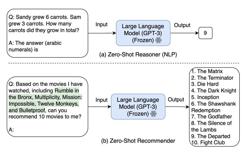 这个文章是阿里内部自己写的一个文章,文章主要讲是设计了一系列的prompt并评估了 ChatGPT 在五种推荐场景的性能。在这个文章里面,并没有对LLM来进行微调,只是依靠prompt来进行全流程设计。