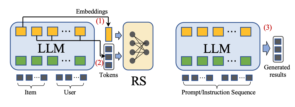 这种建模范式将语言模型视为特征提取器,将物品和用户的特征馈送到LLMs中,并输出相应的嵌入。传统的推荐系统模型可以利用知识感知嵌入来完成各种推荐任务。