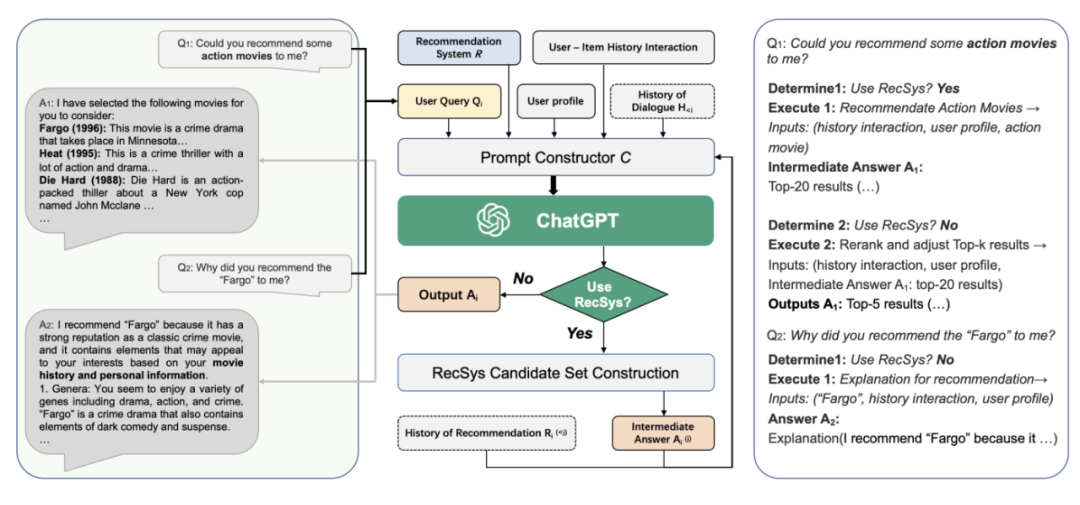 本文中提出了一种用 LLMs 增强传统推荐的范式 ,通过将用户画像和历史交互转换为 Prompt,Chat-Rec 可以有效地学习用户的偏好,它不需要训练,而是完全依赖于上下文学习,并可以有效推理出用户和产品之间之间的联系。通过 LLM 的增强,在每次对话后都可以迭代用户偏好,更新候选推荐结果。和基于检索增强的QA一样,LLM与传统搜推系统结合,为了保证结果更加可靠,还需要增强一下。论文图如下,流程还是蛮清晰的。给推荐系统怎么使用LLM指明了一条路。