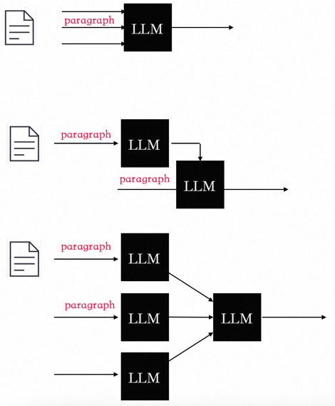 1、利用大模型的总结和推理能力来对长文档进行总结,因为本身长文档就是有很强的逻辑性的,普通的向量建模方式只能一定程度表征语义,如果用bert等传统的来说还有字数限制,对文章的内容进行高精准的提取(文章的表征放到离线),对于文章来说可以采用下面三种方式来进行总结。