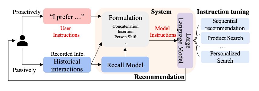 这个论文主要思想是,用户的偏好或需求可以用自然语言描述(称为指令),以便LLMs能够理解并进一步执行指令以满足推荐任务。主要是提出推荐系统的指令调优方法,名为InstructRec。该方法允许用户在与推荐系统交互时,用自然语言指令自由表达他们的信息需求。考虑与用户需求表达相关的三个关键方面,即偏好、意图和任务形式来设计指令。本文采用3B Flan-T5-XL作为骨干型号。由于Flan-T5基于T5进行了微调。