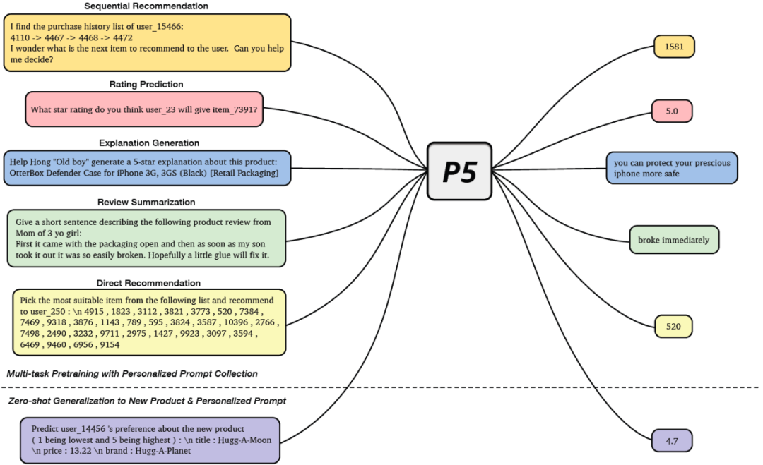 在这个论文中作者提出了一个统一的架构来利用大模型来进行推荐。文章提出来对目前主流的推荐场景(序列推荐、评分预测、可解释性推荐、评论总结等)多个任务都进行了统一,构造了一个模型P5。在预训练阶段,采用统一的一个模型结构,设计不同的prompt模版来进行个性化的推理,所有的任务做到很大程度的统一。预训练模型用了T5模型。通过自己场景的数据Pretraining之后,在各个数据集上的表现都还是不错的,不过在各个数据集合上的表现是不一样的。但是这个论文感觉还是蛮不错的,可以做到各个任务的统一,而且最终效果还是可圈可点的。这个论文值得精读一下。