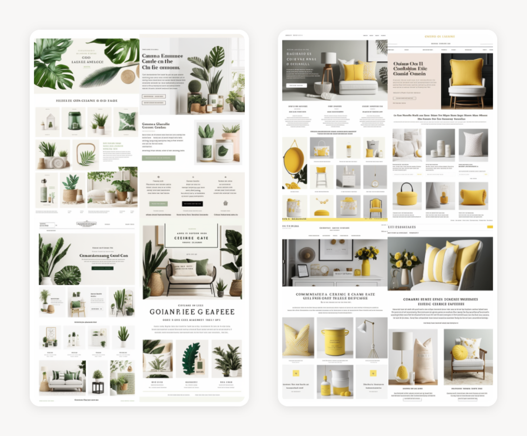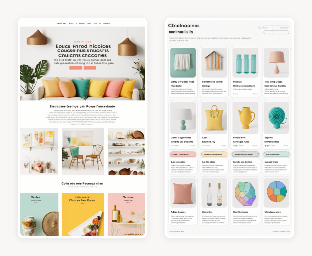 「An e-commerce website that sells home goods, with banners, product arrangement, minimalist style, white background, colorful colors, pictures of related home products, creating a warm atmosphere, UI website design --no mockup --ar 9:16」
