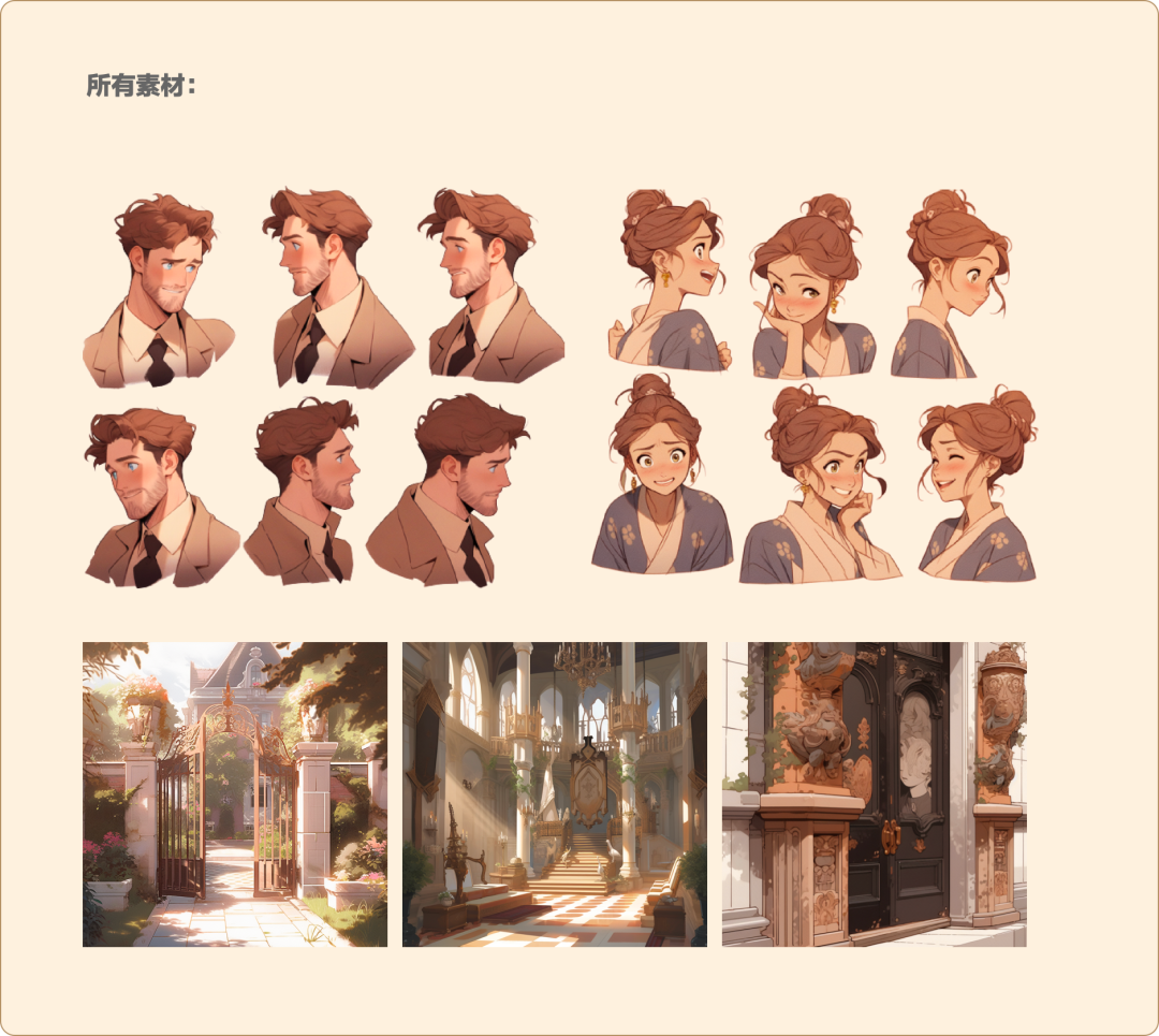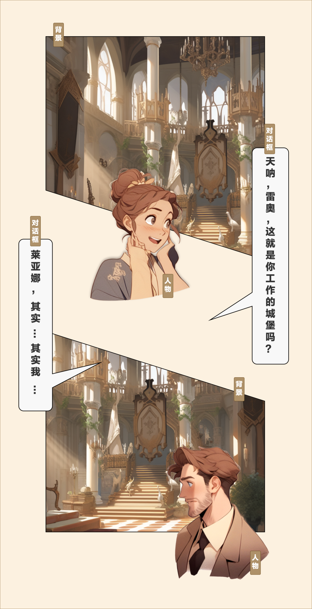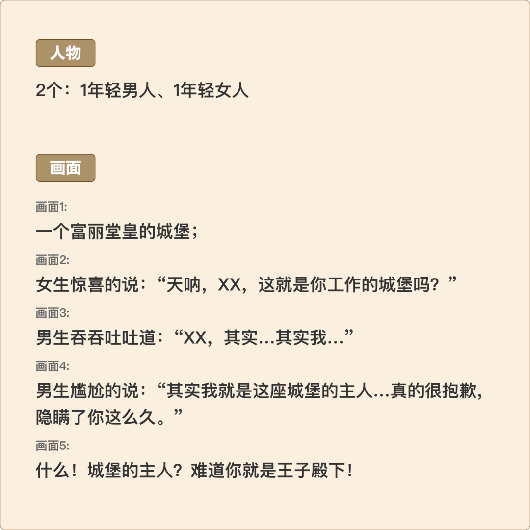 由于只是为了展示教学步骤,小编便想了一个超简单且狗血的剧情:“王子隐瞒身份泡村花”的小故事。截取其中一个小情节,分出下面几个画面: