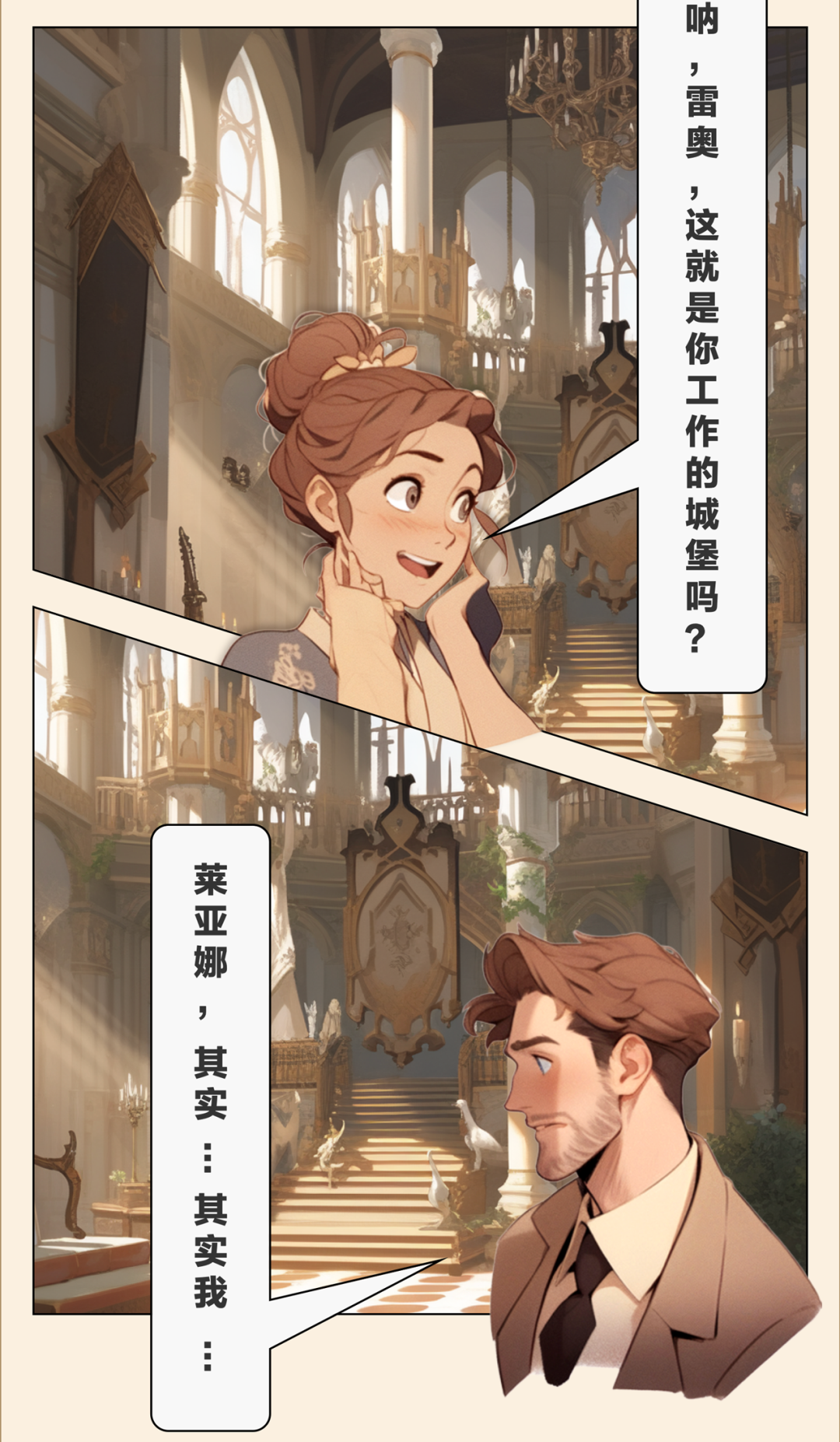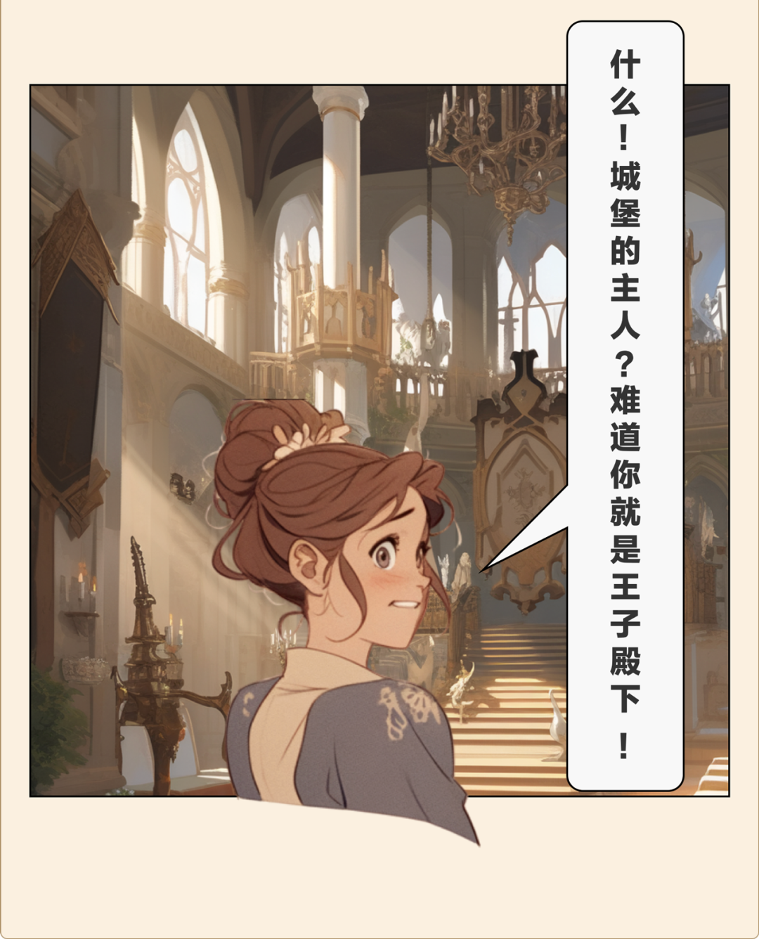 男主角处理好了,接下来就是女主角和背景城堡了,我们需要保证素材画风和男主角是同一种,毕竟他们要在同一幅漫画里共存,这时候就要保存男主角指令里画风的那些关键字,只微调一下性别的参数了,其实很简单,就是只把“男人(man)”改成“年轻的女人(young woman)”就可以了。(*如果你有需要,可以再修改一下女主角穿着的颜色。做完记得抠图备用哦~)