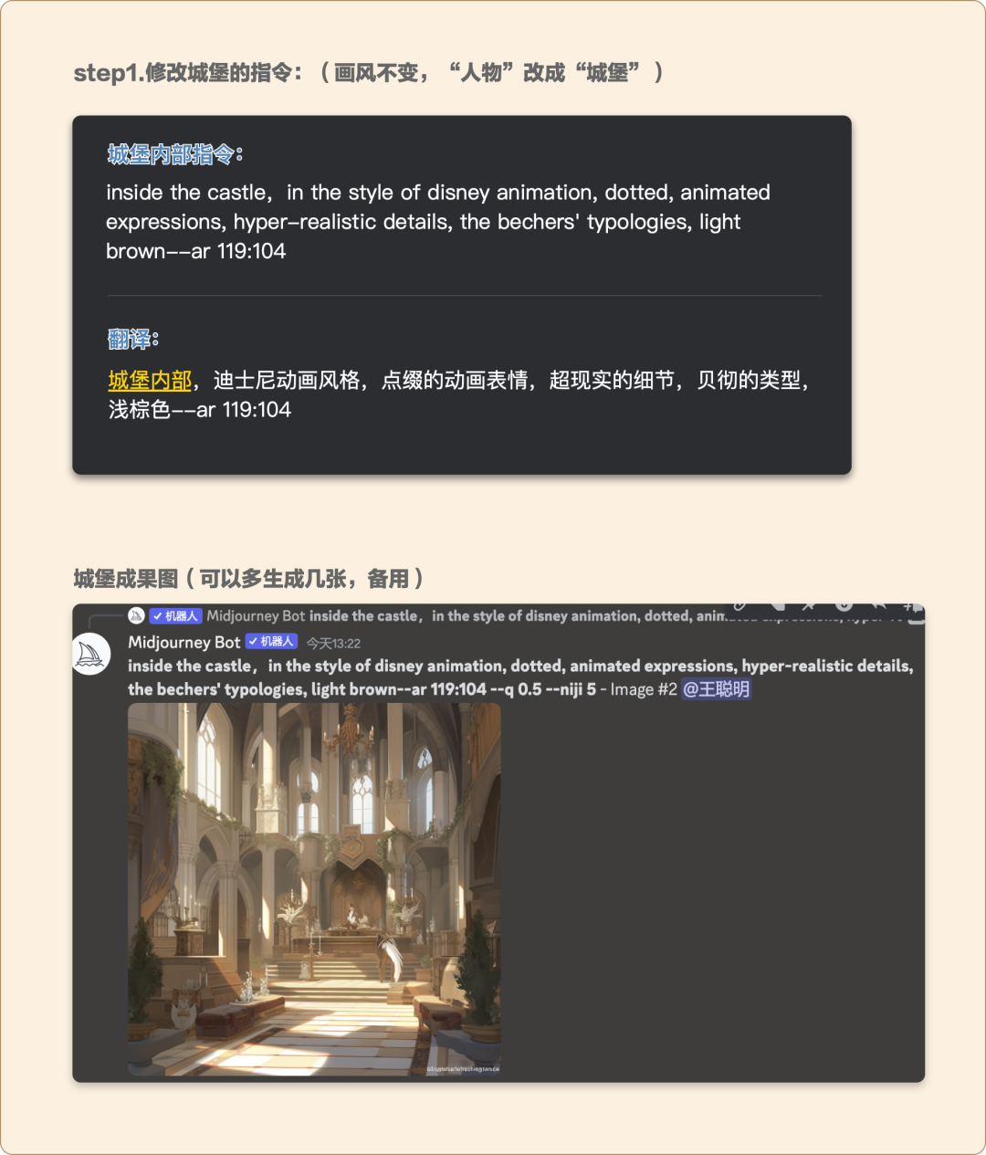 城堡背景也是同理,把人物指令删掉,只改动城堡的英文单词,其他风格单词都不变!