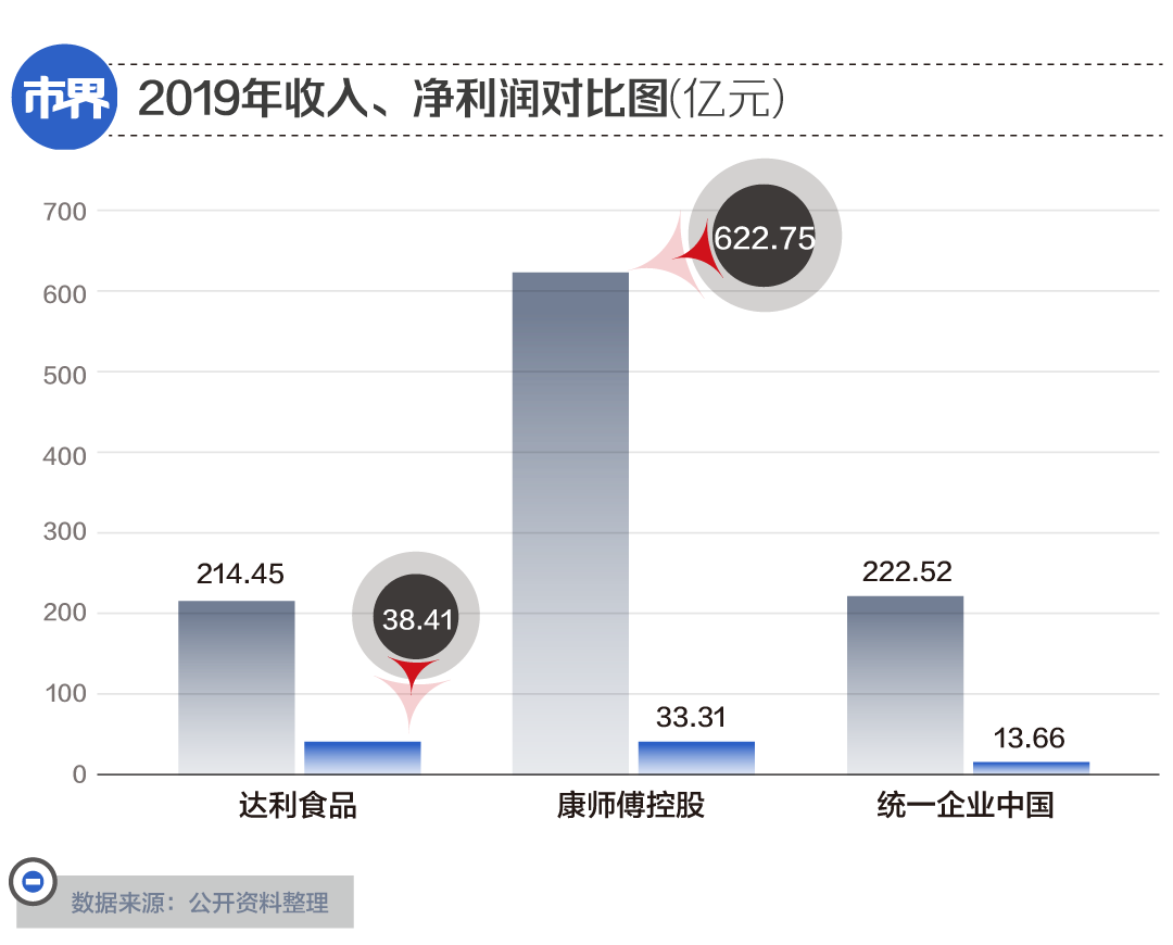 与康师傅控股、统一企业中国两家同样经营食品,且固态食物与饮料均有涉及的同行业对比,达利食品2019年的收入并不高,只是康师傅控股的1/3左右,但净利润达到38.41亿元,为三家中最高。