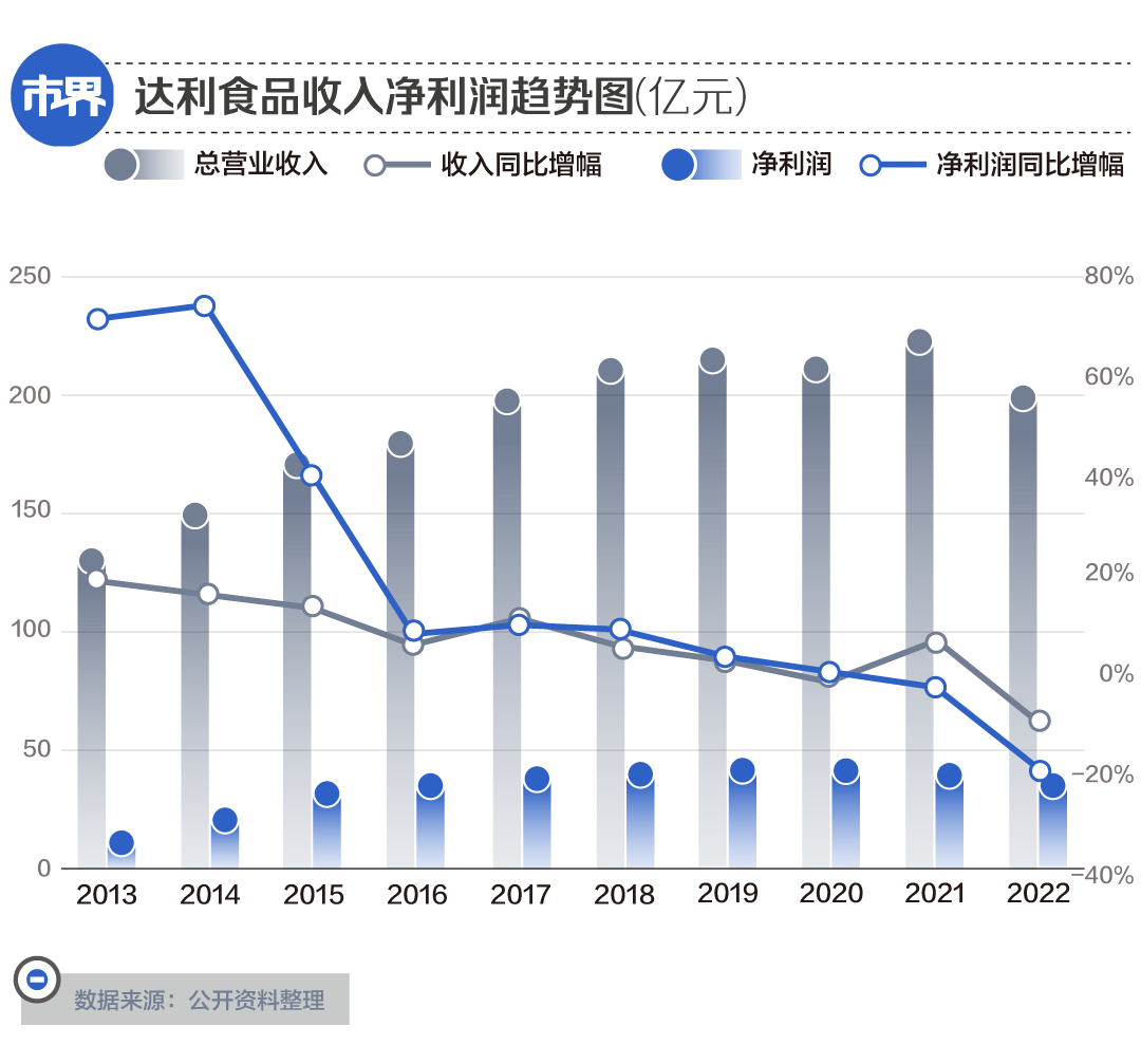 从达利食品自身角度来看,其收入和净利润高点分别在2021年和2020年,但如果从同比增幅来看,2013年以来其收入增速就处于跌宕下滑的趋势,2020年首次出现负增长,2022年更是出现10.46%的同比降幅,净利润也已经在2021年和2022年连续出现同比减少。