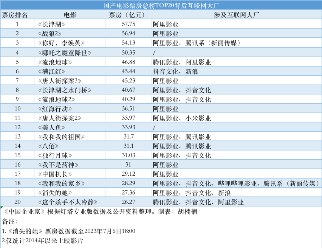 现在来看,于冬的“BAT打工预言”,换成互联网大厂更合适。7月8日14:26,电影《消失的她》官方微博@电影消失的她,发布了一条感谢观众支持的喜报。这条微博公布了《消失的她》最新的成绩:观影总人次破7000万。而就在一个小时前,该账号刚宣布了“票房正式突破29亿!感谢6970万+观众”的喜讯。而这是电影《消失的她》上映的第17天,增速已经明显放缓。据灯塔专业版实时数据,截至7月7日23时,影片《消失的她》当日票房9066.97万元,连续17天获得单日票房日冠,打破由《速度与激情10》保持的2023年连续日冠纪录。事实上,自《消失的她》上映以来已经创造了多个纪录。如,上映10天票房破20亿,成为国产悬疑剧票房冠军。如,单日票房创造了过去三年暑期档的纪录,7月1日当天票房达3.3亿元,超过原纪录保持者《独行月球》。与过去不少爆款电影相似,这匹“黑马”本身自带话题。据了解,《消失的她》由陈思诚担任监制和编剧,朱一龙、倪妮、文咏珊主演,而在出品方中,除了陈思诚的公司壹同传奇影视,也不乏阿里影业、抖音文化等互联网大厂的身影。近年,各大互联网大厂已不仅仅是电影下映后播放渠道之一,他们对电影产业链参与程度已经从宣推发行,逐渐成为电影制作出品的主力。除了《消失的她》之外,多个爆款影片背后都有阿里、腾讯、抖音等互联网大厂的参与。据《中国企业家》梳理,国产电影票房总榜TOP20影片中,阿里影业参与的就有17部,抖音文化参投了其中7部,腾讯影业、新浪、哔哩哔哩影业以及小米影业等也都有参与。