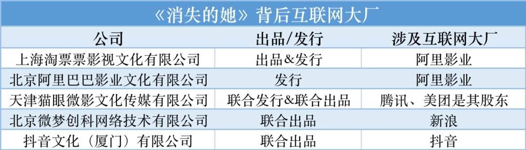 经过初期的传播发酵,上映三天后《消失的她》开始出圈。猫眼专业版数据显示,《消失的她》排片率从34.3%一路涨到51%,直到上映两周后其排片率还在50%左右。而其预估票房也在不断刷新,据猫眼专业版数据,上映前其预估票房为7.5亿元,3天后调整为14亿元,7天后,则调整为30亿元。事实上,《消失的她》和近年来许多爆款电影一样,都以微博、抖音等互联网平台为重要的宣发渠道。上映半月以来,《消失的她》也是微博、抖音、快手等各大平台热搜榜单上的常客。如,#网友理解的李木子手势、#泰国孕妇坠崖案当事人谈电影消失的她、#消失的她 畸形秀、#当情侣看完消失的她等电影衍生话题的加入,更是让该电影引起了新一轮的热议。从《消失的她》来看,各大互联网企业已经从过去的宣发渠道逐渐向影视行业产业链的上游发展,他们对影视的参与度也在逐步加深。据了解,《消失的她》由北京壹同传奇影视文化有限公司、上海淘票票影视文化有限公司出品,联合出品方包括上海电影(集团)有限公司、上海壹同影视制作有限公司、北京微梦创科网络技术有限公司、抖音文化(厦门)有限公司等15家公司。其中,壹同传奇影视文化有限公司是陈思诚创立的影视公司。据某招聘网站显示,北京壹同传奇影视文化有限公司是一家覆盖影视全产业链的综合性影视公司,业务覆盖电影、电视剧、艺人经纪、IP娱乐营销等领域,公司核心主创是陈思诚。另一个出品方上海淘票票影视文化有限公司背后则是阿里影业,公司法人代表为阿里影业总裁李捷。同时,阿里影业还参与了该片的发行。主发行的两家公司上海淘票票影视文化有限公司和北京阿里巴巴影业文化有限公司,都属于阿里影业旗下公司。企查查显示,抖音文化(厦门)有限公司成立于2020年,由北京字节新异科技有限公司100%持股,隶属于抖音集团。公司法人代表支颖,此前曾担任抖音副总裁、内容产品及西瓜视频负责人。北京字节新异科技有限公司同时还100%投资控股了西瓜视频影业(厦门)有限公司、长沙字节跳动文化传媒有限公司等4家公司。联合出品方北京微梦创科网络技术有限公司,背后则是新浪。法人代表曹菲为新浪集团副总裁。除此之外,腾讯、美团也间接参与了《消失的她》的投资。天津猫眼微影文化传媒有限公司作为联合发行和联合出品,而腾讯投资和美团都是该公司的股东——两家旗下公司林芝利新信息技术有限公司和上海三快科技有限公司分别对其持股11.2330%、8.2694%。2014年,博纳影业董事长于冬就曾表示,“电影公司未来都将给BAT打工。”当年的预言早已成了现实,不只是《消失的她》,多部高票房爆款电影背后都有大厂身影。