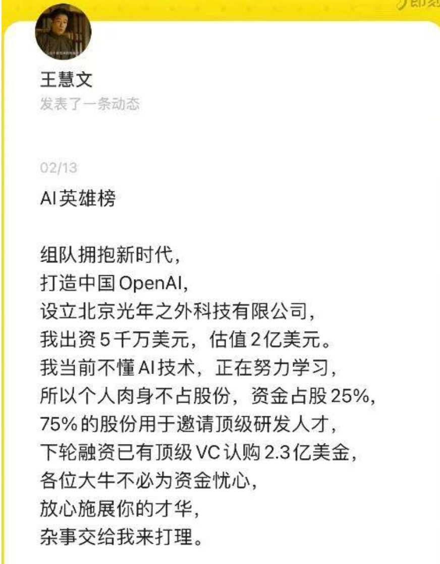 于是各路大佬纷纷重启创业,比如李开复、曾经搜狗王小川、当然还有声势最大的王慧文创建的光年之外。
