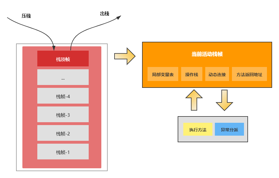 虚拟机栈通过压栈和出栈的方式,对每个方法对应的活动栈帧进行运算处理,方法正常执行结束,肯定会跳转到另外一个栈帧上。在执行的过程中,如果出现异常,会进行异常回溯,返回地址通过异常处理表确定。栈帧在整个JVM体系中的地位颇高,包括局部变量表、操作栈、动态连接、方法返回地址等。