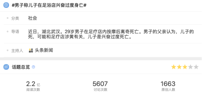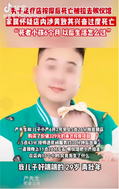 一位严先生表示,他的儿子,29岁的小严,在足浴店离奇死亡。事发当天,早上5点26分,小严早早到了这个足疗店,购买了329元的按摩服务。直到晚上11点26分,殡仪馆直接到足疗店,将已经死亡的小严抬走。小严在店内的整整10几个小时,又到底出了什么变故?小严的父亲严先生,根本无法接受这个事实,他怀疑,店里提供了“黄色”服务,导致儿子兴奋过度,最终死亡。而小严的遗体,以及房间内的情形,也让他们更加坚定了这个想法。去过正规按摩店的人都知道,技师在按完摩之后,会用干净的毛巾将脚擦干净,根本不需要顾客再用卫生纸擦拭脚上的水。对小严的家人来说,几乎笃定了小严是花钱买“服务”,兴奋过度导致的死亡。父亲严先生说了一句:儿子29岁,无基础疾病,也没不良嗜好。如果小严的死因,真如小严家人所说的,那么购买黄色服务而死亡,本身就是最大的不良嗜好吧。当然,事情具体的真相是什么,在警方通报之前,一切都只是猜测。更何况,小严上有父母需要赡养,下有6个月的幼女需要抚养。严先生说:孙女才6个月,后续的抚养支出,远不止50万。