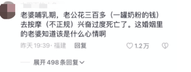 大众难以相信:一个五点半就去了足疗店“放松”的人,抛下哺乳期的妻子,嗷嗷待哺的孩子的男人,能当一个好丈夫、好爸爸。“老婆哺乳期,老公花三百多(一罐奶粉的钱)去按摩,兴奋过度死亡了。这婚姻里的老婆知道后,该是什么心情啊?”初为人母、身材走样、情绪起伏大,却又将全部精力投注到孩子身上。她可能为了照顾襁褓中的女儿,晚上根本睡不了一个整觉。他在清晨,需要给孩子冲奶粉的时候,花几百元去做了按摩。在妻子努力适应“妈妈”这个身份时,赤身裸体躺在足疗店的床上。而现在,年幼的孩子,以及一堆烂摊子,等着妻子来收拾。她在丧夫的同时,还要遭受着丈夫可能背叛的心理煎熬。说实话,在这件事情里面,我最感同身受、最觉得心疼的,就是那个可怜的妻子。张泉灵在《奇葩说》中说过:你们以为,有婚姻的时候,你们就不是单身妈妈了吗?我突然想起之前看《守护解放西》,里面一位女性令我印象深刻。一男子深夜在酒吧里,为了小三和人发生了争执,升级成斗殴。对方报警,该男子逃之夭夭,于是警方联系到了他的妻子。孩子才9个月,妻子深夜被叫到派出所,她不断给对方道歉,希望对方原谅自己的丈夫。直到看到监控视频的画面,她才知道这场纷争,竟然是丈夫为小三引发的。她也曾有姣好的容貌,为了生下孩子,她忍着巨大的痛楚做试管,身材走样,却遭到丈夫嫌弃。本该在家带孩子,尽父亲责任的夜晚,他却在酒吧夜夜笙歌,美人在怀。就连最后收拾烂摊子,都是靠妻子出面,不断向被打的人道歉,才达成和解。最讽刺的是,就连那些被打的陌生人都说:姐姐,我们不怪你,你也是受害者。而后续男人到派出所,都是带着小三一起来,不把妻子当回事。他就像吸血鬼一样,依附在妻子身上,吸噬着她身上所有的价值,而自己根本不付出。正如武志红老师那本《巨婴国》描写的那样,很多人在结婚后仍把自己当成一个婴儿,让伴侣继续延续母亲或者父亲的角色,照顾自己,自己依然是那个没长大的巨婴。结婚生子后,女性迅速成长,适应了妻子、妈妈的身份。而一些男人却依然沉溺于自己的兴趣与爱好,你说他几句,他却反驳说:男人至死是少年。正如有人调侃,终于知道女人结婚为什么要叫“新娘”了。他们年少的时候,有什么事都喊“娘”;到了结婚,什么事就喊一声“老婆”,这不就是“新娘”么?直到现在,在很多男人眼里,他们觉得家里的地板永远是自己干净的,饭菜永远都是自己香的,衣服永远都是自己洗干净码放整齐的,家里什么东西没有了,或者找不到,只需大叫一声老婆就可以。他们不明白,买菜做饭有多繁琐,洗衣搞卫生有多辛苦,起夜哄孩子泡奶粉有多折腾人,更不明白,工作一天的妻子,回家还要应对各种家务、辅导孩子作业有多烦心!我到了中年才懂,原来,我并没有在银行存钱,所以也取不出来。”妻子和丈夫的关系其实就是这样,你从不给予爱和关怀,等你想索取的时候,也没有资格得到这些了。而是,在她带娃满身疲惫的时候,丈夫的一句“你去睡吧,我来哄就好”。是在她为家中琐事烦忧时,说一句“交给我吧”,获得满满的安全感。是不把所有重担推到一个人身上,两个人一起承担婚姻的苦与甜,携手同行。别等那个爱你的人,失望攒够了变绝望,再后悔曾经的所为。爱如篝火,只知烤火不懂添柴的人,再旺的火焰也会燃烧殆尽。看更多走心好文章
