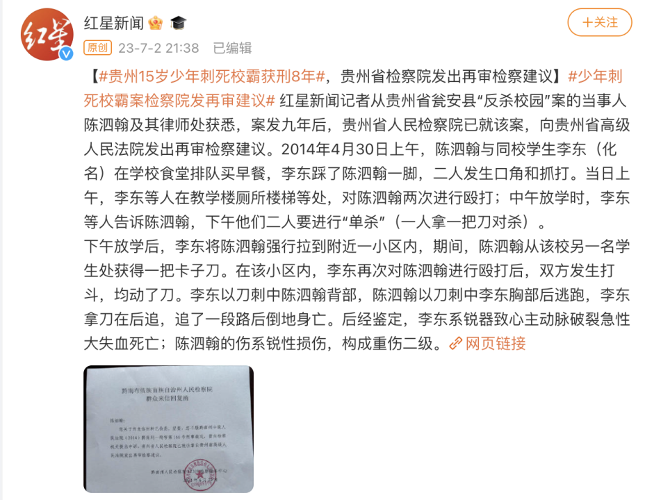 但是前两天一封冲上热搜的「检察院回复函」,再次将我们的记忆拉回9年前,想起了那个反杀校霸的“冲动少年”。