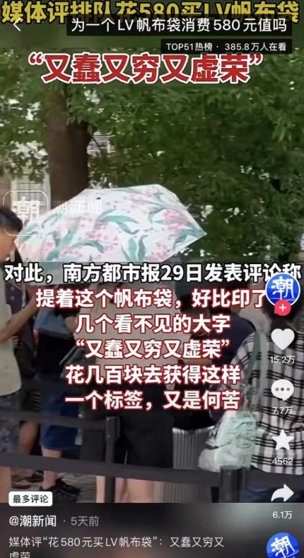 为了庆祝开业攒人气,他们推出了一款高达45厘米,一个成年人都难以环抱的“巨无霸”级“合味道方便面桶”,定价168元。当然,这么大的“巨无霸”不可能只有一碗面,大桶也仅仅是个包装,里面装了24桶普通大小的杯面,平均下来,其实价格也就和普通泡面差不多。然而,正是它限量又限购的设定,瞬间吸引了无数年轻人的眼球,让山姆超市的这款泡面身价倍增,竟然到了一跃成为“奢侈品”的地步。为了抢到这款限量版巨型泡面桶,不少人在超市开业前一个小时就在场外排起长龙,超市里更是人山人海。巨大的人流量让超市工作人员都应接不暇,只能拿着喇叭在门外大喊“场内人员已满,需排队等候30分钟。”在某些平台上,这款泡面的价格已经被炒到500-800元不等的价格,最高的甚至卖到了1999元。看到这里,相信很多人都会觉得好笑,吃了又不能成仙,谁会花这么多钱去买20多桶泡面外加一个巨型泡面桶啊?然而没想到的是,即便价格已经相当离谱,这款“面中巨无霸”仍是供不应求,社交平台上,到处都是抱着大桶打卡炫耀和求代购的人。看到东西这么好卖,让很多黄牛甚至直接摆起了架子,明确表示不包邮不议价,先到先得。很多网友对这种跟风的迷惑行为表示不解,甚至还有人说,前段时间不是还在抵制山姆吗?著名奢侈品品牌LV,与上海的几家咖啡店搞起了联名书店,只要买两本书,就可以送你一只印着LV品牌logo的帆布袋。然而现实却是,书店里卖的也是LV出品的书,最便宜的一本也要将近300元。也就是说,想拿到这个除了logo之外没有任何特殊之处、外面十几块钱就能买到的帆布包,最少也需要580元左右。没错,在上海30多度的炎热天气和阳光的暴晒下,无数年轻人以“全款拿下人生第一件LV”的名头排起了长队。没排上的,也纷纷跑去黄牛那里用更高的价格交上一笔“智商税”。可即使再高的价格,也难以阻挡韭菜们的热情,网上一条收银条显示,有人甚至为了拿到帆布包,花880元买了两本书。买下帆布包之后,他们就忙不迭拍照发朋友圈炫耀,有人甚至炫耀自己集齐了所有颜色。面对这出现代版的“买椟还珠”社会乱象,南方都市报用了一个词精准形容他们:“又蠢又穷又虚荣”。真正的有钱人会花几百块钱排几个小时的队,去买这样一个破袋子吗?根本不会。而这样彻夜排队去买的,基本都是又穷又蠢又爱炫耀的人。背这样的袋子,就相当于把又蠢又穷又虚荣写在了脸上。媒体点评的这句话虽然狠了点,但确实也有那么一点点道理。168元的泡面桶和十几块钱的帆布袋,本来就算不上什么“奢侈品”,花大价钱买下它们的人,不过是想通过这些东西来炫耀,凸显自己“精致”的身份地位,可他们没有想到的是,这样反而给自己贴上了“又蠢又穷又虚荣”的标签。有句话说得好:“如果不让你发社交平台你依然去吃八百一顿的下午茶,那下午茶才算是你的兴趣爱好”。真正有钱的人,真正喜欢奢侈品的人,根本不会买一个帆布袋买一桶泡面就忍不住昭告天下,这样的行为只会暴露自己的愚蠢。Ted演讲《诚实面对自己的金钱问题》中,Tammy Lally曾提出一个概念,叫“金钱羞耻”。“把自我的价值等同于向外界展示财力的价值,把‘精致生活’等同于‘金钱生活’。”简而言之,就是我吃的、穿的,用的很贵,所以我很“贵”,反之我吃的、穿的、用的很廉价,那么我这个人就很廉价。他们把自己的价值等同于自己买的东西的价值,而当自己买的东西价值不高的时候,就会产生羞耻感。于是,很多人买不起真正的LV,就趋之若鹜地买一个几百块的帆布袋,他们消费不起高端的奢侈品,可即使透支信用卡、借钱也要继续“打肿脸装胖子”。根据时尚商业媒体Jing Daily在2021年的报道,全球约10%的奢侈品消费出自Z世代之手,而在中国这一比例则达到了15%。而与之对应的是,尼尔森的《2019中国年轻人负债状况报告》中显示,中国86.6%的年轻人都在使用信贷产品,但这之中只有一半的人可以在当月还清。之前网上有一句话,叫“买鞋敢花一两万,出门只吃盖浇饭”,道尽了许多追求“精致”的普通年轻人的生活现状。很多年轻人,拿着3000的工资,明明饭都吃不起了,却为了不被别人看扁,一直强颜欢笑,靠着贷款买来的奢侈品在朋友圈和别人面前过着30000的生活,还自以为鹤立鸡群。古语有云:“侈则多欲,君子多欲则贪慕富贵,枉道速祸。”虚荣不仅不会使人变得精致,相反,它更多时候带来的,往往会是一出又一出悔恨终身的悲剧。2019年5月28日,珠海一名27岁的女孩烧炭自杀。她的母亲怎么也想不通,为什么看起来阳光开朗的女儿,会突然选择离开人世。直到她在整理女儿的遗物时,发现了藏在其中的大量信用卡,一共有14张。她妈妈猜,这14张信用卡,或许就是压垮她的真正原因。这14张信用卡,全部为欠款状态,多的有25万,14万的,少的有几千一万的,林林总总加起来,负债多达87万!而这个女孩一个月的工资也不过3000多块,每个月的账单基本都是分期和各种扣费项目。整整87万,如果是在不算发达的二三线城市,已经足够全款买下一套房。但这个女孩换来了什么呢?20多双四季的鞋子,一些甚至来不及开封的手提包,各种大牌的化妆品、衣服等等。其中有些她根本用都不用,只是变成了一种“符号”,象征性地放在她的房间。最后这满屋子的奢侈品,全都变成债务压在了她的肩上,愈发沉重,重到她不得不选择轻生来了结。女孩