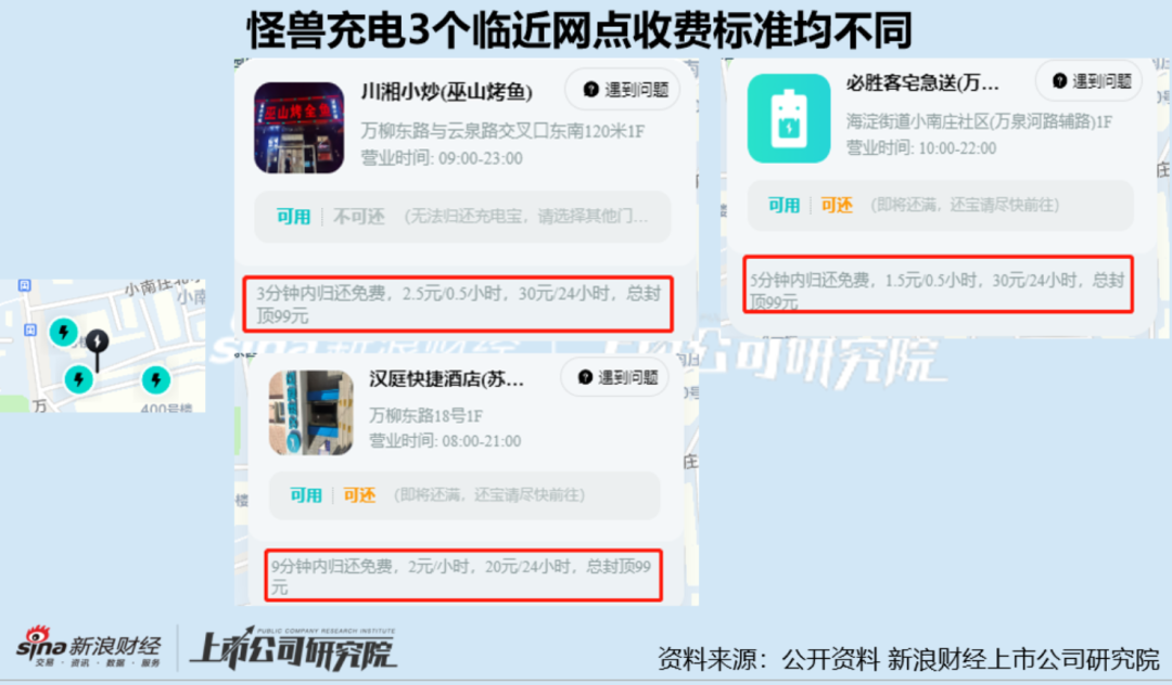 上述两个点位的共享充电宝的每24小时封顶价格高达70元,总封顶99元,是该区域24小时封顶价格最高的共享充电宝。