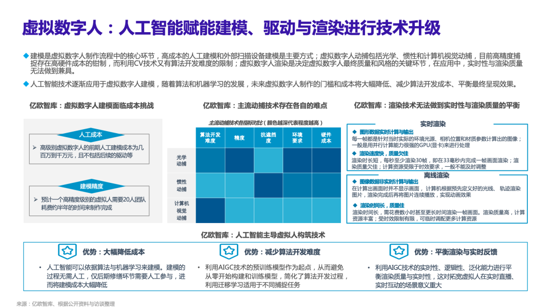 在AI与其他信息技术融合愈发紧密的时代,虚拟数字人受到AI技术的影响也是比较明显的。虚拟人建模、驱动、渲染目前存在成本、开发难度、互动性不足的问题,而利用AIGC技术可以规避上述缺点。