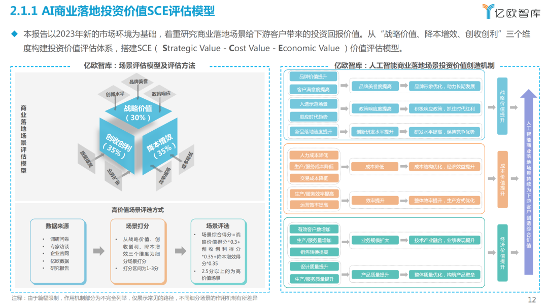前两年的报告关注AI技术的落地能力,随着市场环境和资本市场关注重点的变化,今年将研究方向转变为AI商业落地场景的投资价值,通过构建SCE价值评估模型,从战略价值、降本增效和创收创利三个方面评估AI技术的引入给下游客户创造的综合价值。