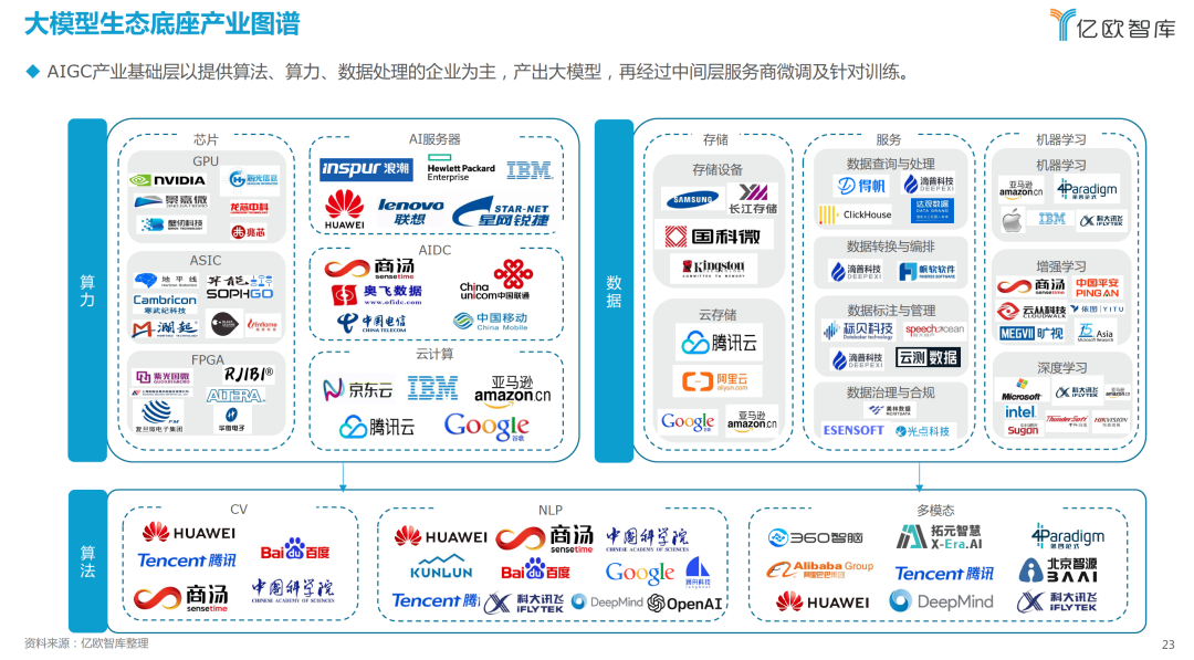 AIGC产业基础层以提供算法、算力、数据处理的企业为主、产出大模型,再经过中间层服务商微调及针对训练。