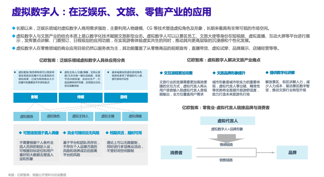 AI+虚拟人在泛娱乐、文旅、零售业可以实现可控、实时交互、主要功能接入口的作用,全覆盖内容输出方及内容消费用户的痛点。