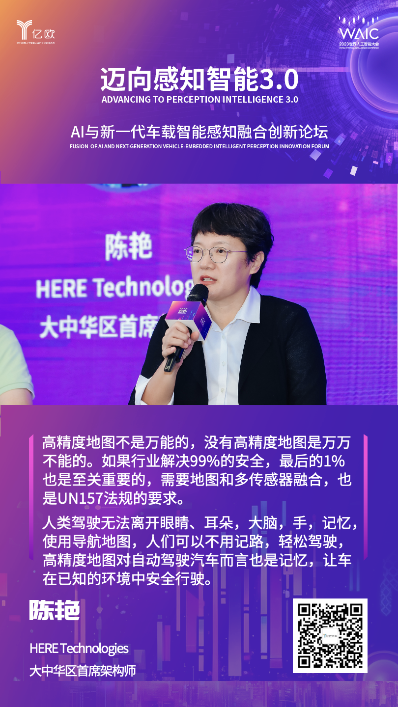 针对目前“去高精地图”的趋势,位置数据和技术平台HERE Technologies大中华区首席架构师陈艳提出了不一样的看法。她认为,高精度地图虽然不是万能的,但没有高精度地图是万万不能的。如果行业解决99%的安全,最后的1%也是至关重要的,需要地图和多传感器融合,这也是UN157法规的要求。人类驾驶无法离开眼睛、耳朵,大脑,手,记忆,使用导航地图,人们可以不用记路,轻松驾驶,高精度地图对自动驾驶汽车而言也是记忆,让车在已知的环境中安全行驶。