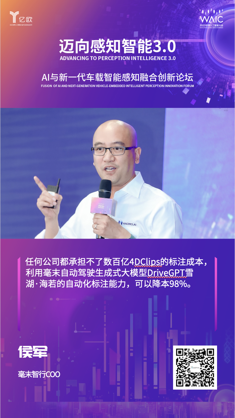 “从低速到高速,从载物到载人,从商用到民用”,这是毫末智行始终遵循的战略发展路径,毫末智行COO侯军认为,任何公司都承担不了数百亿4DClips的标注成本,利用毫末自动驾驶生成式大模型DriveGPT雪湖·海若的自动化标注能力,可以降本98%。