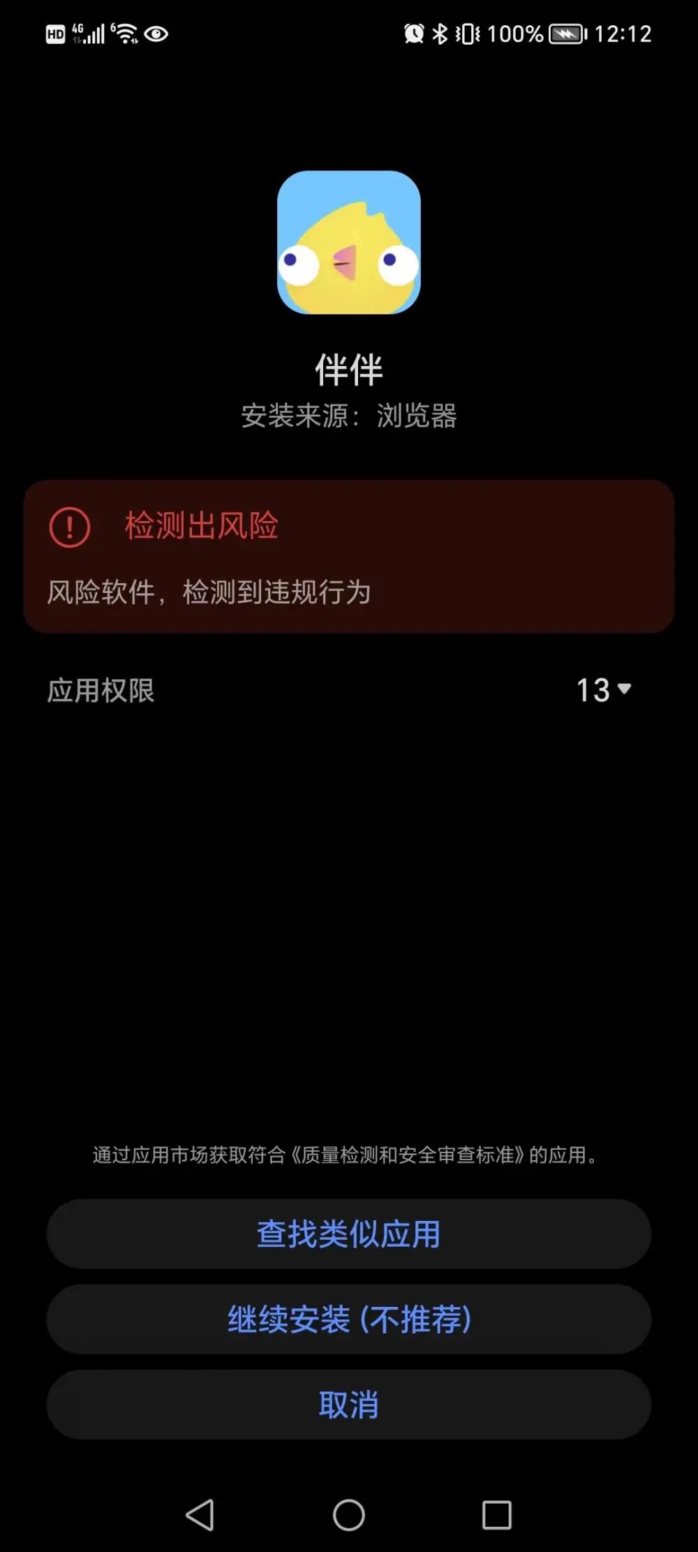 截至发稿前,21记者在华为应用市场上无法搜到伴伴的下载途径,苹果APP Store上仍能正常下载、可注册登录,华为手机尝试在伴伴官网上扫码下载APP,则显示“风险软件,检测到违规行为”。欢欢语音同样在华为应用市场上销声匿迹,通过苹果APP Store仍能下载,但无法注册和登录。