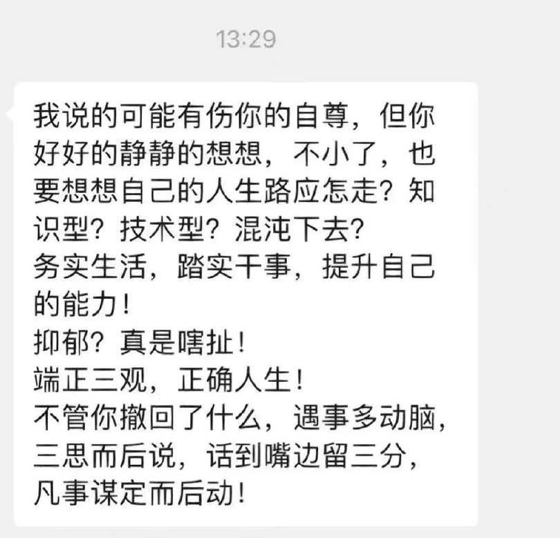 “我说的可能有伤到你的自尊,但你好好地静静地想想,不小了,也要想想自己的人生路应怎么走?知识型?技术型?混沌下去?