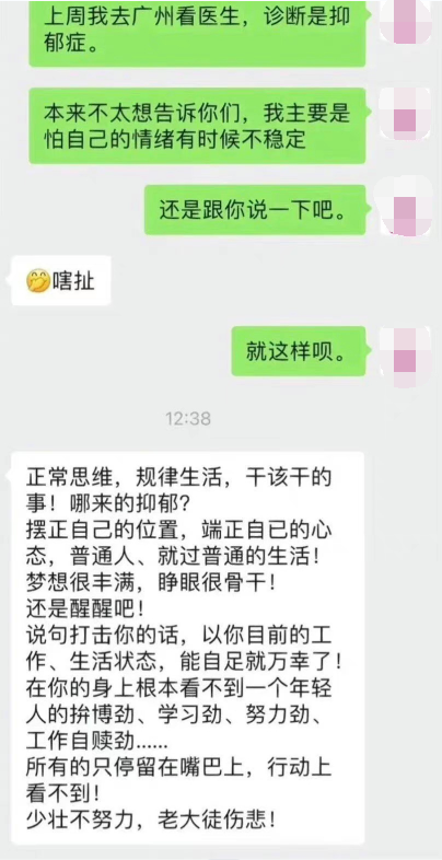 另一个是,一个年轻人患了抑郁症之后,把自己的病情告诉了父母,却得到这样的回复:
