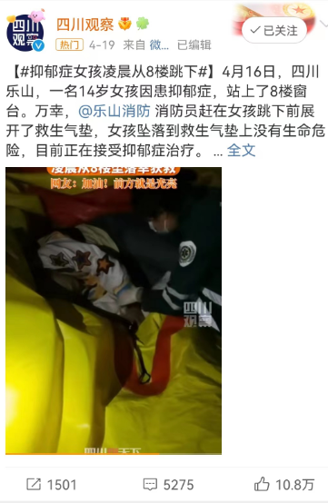 孩子们身上发生了什么?前几天看到“抑郁症女孩凌晨从8楼跳下”的热搜,让人的心一下就提起来了。