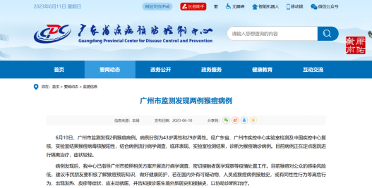 据广东疾控官网公布信息显示,6月10日,广州市监测发现2例猴痘病例,目前病例正在定点医院进行隔离治疗,症状较轻。而此前,2023年6月6日,北京疾控也公布了北京市医疗机构报告的两例猴痘病毒感染病例情况,其中一例为境外输入病例,另一例为境外输入病例的关联病例,两名病例均是通过亲密接触感染。