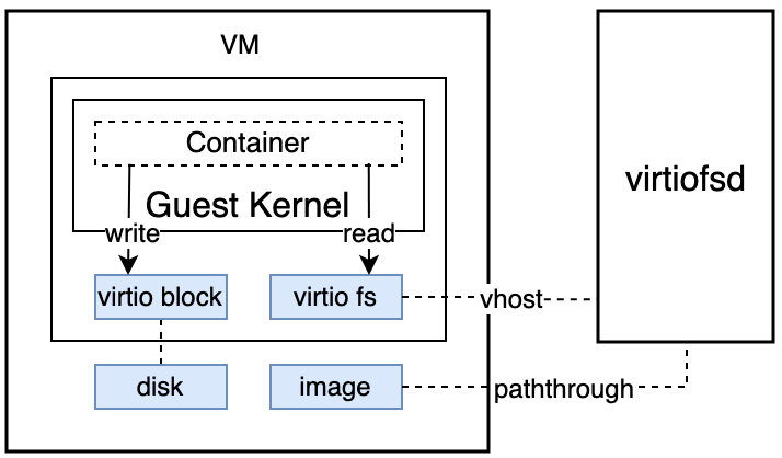 使用更为灵活的 virtiofs 协议为容器提供 rootfs 目录,为了达到极致的性能我们对 virtiofs 协议的服务端进程 (virtiofsd) 进行了 native 改造,改造后的 virtiofsd 从独立进程变成了 VMM 的一组线程,处理上优化了 vhost 逻辑,可以像普通 virtio 设备一样直接操作后端文件系统。
