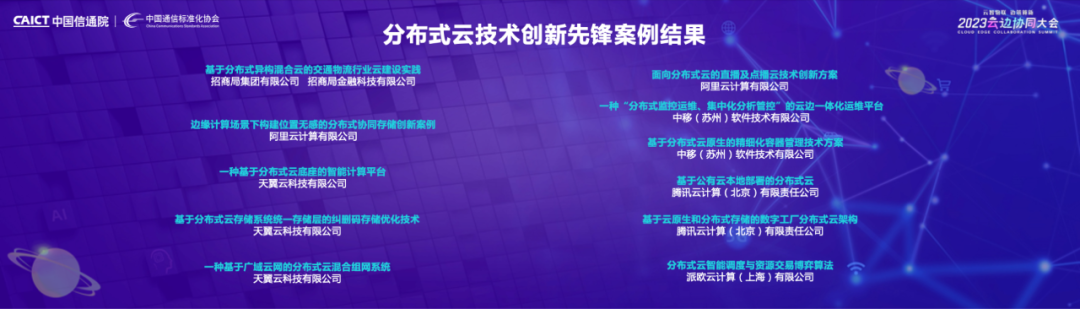 大会发布了 2023 云边端一体化技术创新与最佳实践先锋案例,分布式云、边缘计算与 AIoT 平台,分别有 20 个、27 个和 12 个案例获评技术创新与最佳实践先锋案例,为推广相关技术的先进经验与最佳实践树立了行业标杆。
