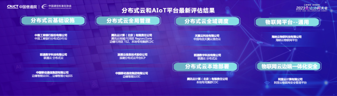 在成果发布环节,大会发布 2023 年分布式云、边缘计算、AIoT 平台等最新评估结果,共有来自 11 家企业的 22 个产品及平台通过了本次评估。