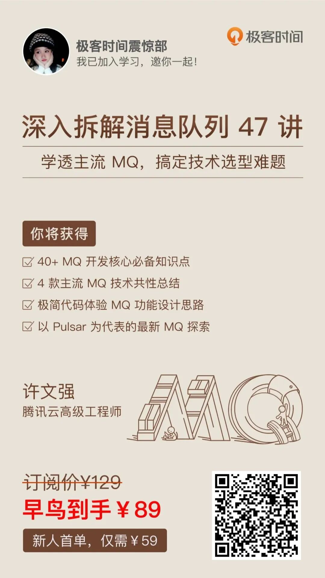 这个学习路径来自极客时间刚推出的课程《深入拆解消息队列 47 讲》。专栏作者是 腾讯云 Kafka 技术负责人 许文强。