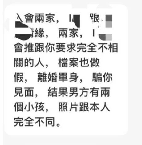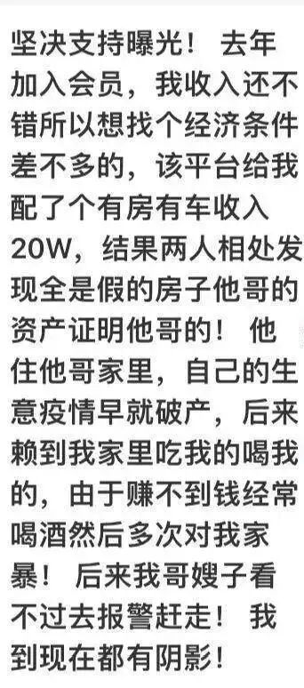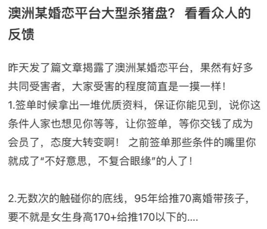 此前,有某平台的华人女会员爆料称,平台曾经给她介绍一个条件非常好的男人,财产、房屋和车辆一应俱全。