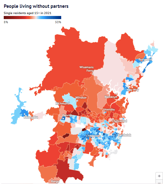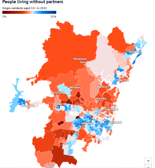 而澳媒此前公开的一份“单身地图”显示,从Bondi到Cabramatta的悉尼城区,无伴侣的成年人数量一直在上升,有些地区甚至占当地居民的一半。