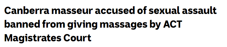 据澳洲广播公司报道,首都领地一名40岁的华裔按摩师已被禁止提供按摩服务,因其涉嫌在堪培拉的一家按摩店中,对一名女顾客实施了性侵。报道称,本周一,王波超(Bochao Wang,音译)在首都领地地方法庭出庭,他被控告两项未经同意性交罪,以及一项未经同意实施猥亵行为的罪名。提交给法庭的文件称,上周六,王波超在Belconnen的一家按摩店工作时,一名女顾客进店点了按摩服务。这名顾客表示,每次来这家店通常是由一名女按摩师负责给她做按摩。但她被告知那位按摩师没空,于是王波超代为提供按摩服务。法庭文件显示,王波超告诉这名顾客“放松”,随后开始了持续一个小时的按摩服务。在按摩快要结束的时候,这位顾客声称她能听到其他工作人员下班离开公司时的对话。她还听到了店前的卷帘门被拉下,只剩下了她和王先生在场。Bochao Wang(图片来源:《堪培拉时报》)该女子表示,她当时惊呆了,不知所措,然后告诉王波超:“我得走了”。她支付了按摩费用后便打电话给她的丈夫,丈夫建议她应该立即报警。在周日被捕后,王波超告诉ACT警方,整个按摩流程是正常的,他并未做任何出格的事。在法庭上,王波超被禁止从事按摩师的工作,但允许在这家按摩店中从事行政工作。法庭还要求王波超在该按摩店工作期间必须有其他员工陪同。![]()