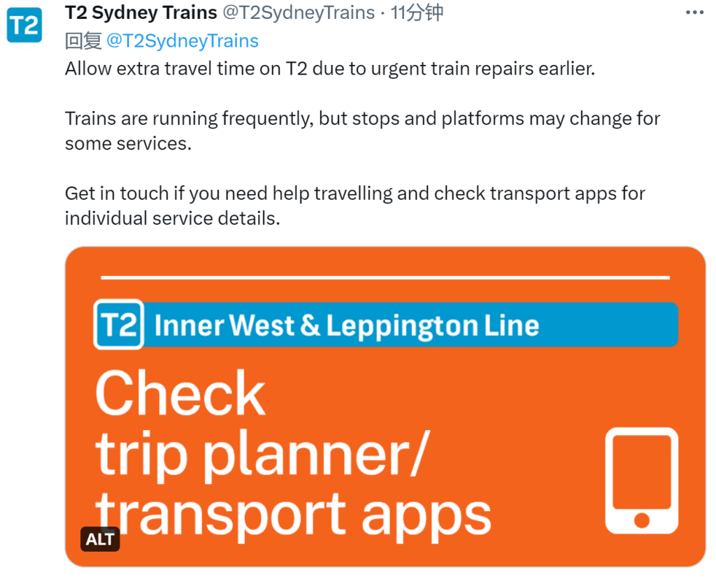T2 Sydney Trains官方Twitter周一早间发布消息称,由于列车需要进行紧急维修,T2线出现延误,旅客需要预留出额外的出行时间。