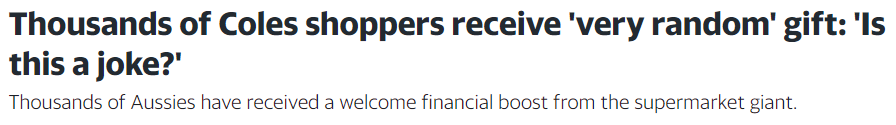 Yahoo新闻7月9日报道称,当澳洲家庭努力节省在超市的开支时,Coles的顾客们却惊喜地收到了价值50-100澳元的积分或礼品卡。
