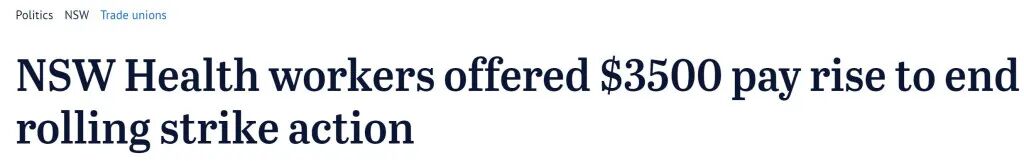 《悉尼晨锋报》报道称,新州医护工作者在举行多次罢工后,最终获得了3500澳元的加薪。对于那些收入较低的医护工作者而言,这相当于加薪8%。