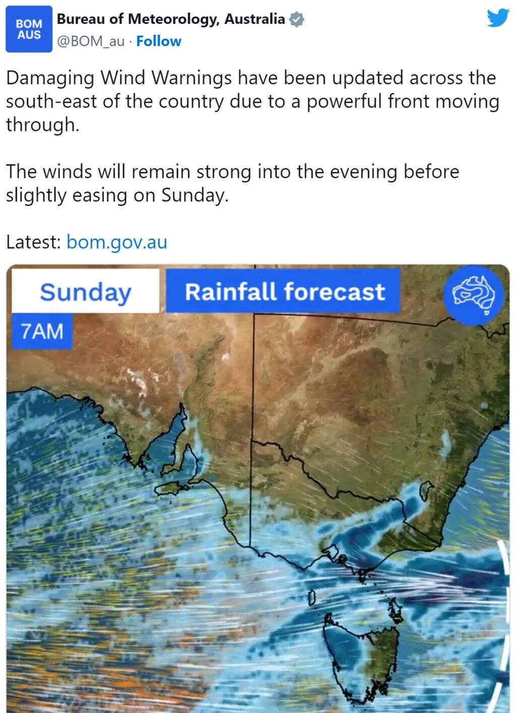 从周六开始,一股强劲的冷空气便朝着澳洲东南部地区移动。周日上午,气象局向维州、新州、首都领地以及塔州部分地区发出了恶劣天气预警。