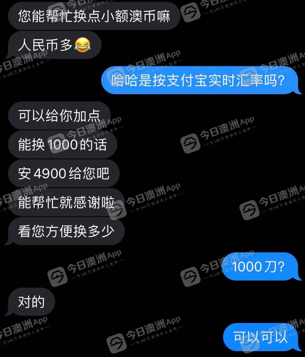 很快,对方询问是否能“帮忙换点小额澳币”,语气诚恳客气。