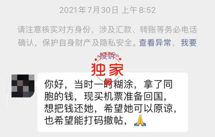 今日澳洲App发布新闻后,宋某曾主动联系记者,称“一时糊涂,拿了同胞的钱”,表示“准备回国”,并提出“打码撤帖”的请求。