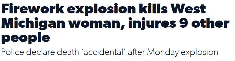 此外,在密歇根州的帕克镇,同样是晚上十一点多,社区正在燃放烟花庆祝独立日的到来,突然烟花意外爆炸,造成1人死亡、10人受伤。