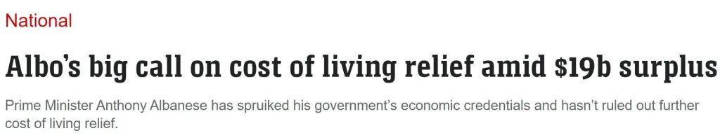 澳洲新闻集团报道称,随着预算盈余飙升至190亿澳元,总理Albanese不排除在今年年底前再次发放生活补贴。