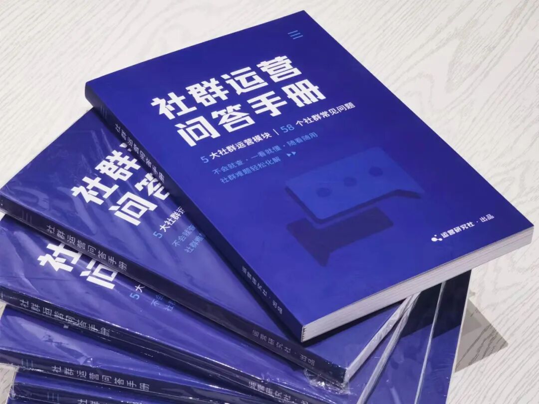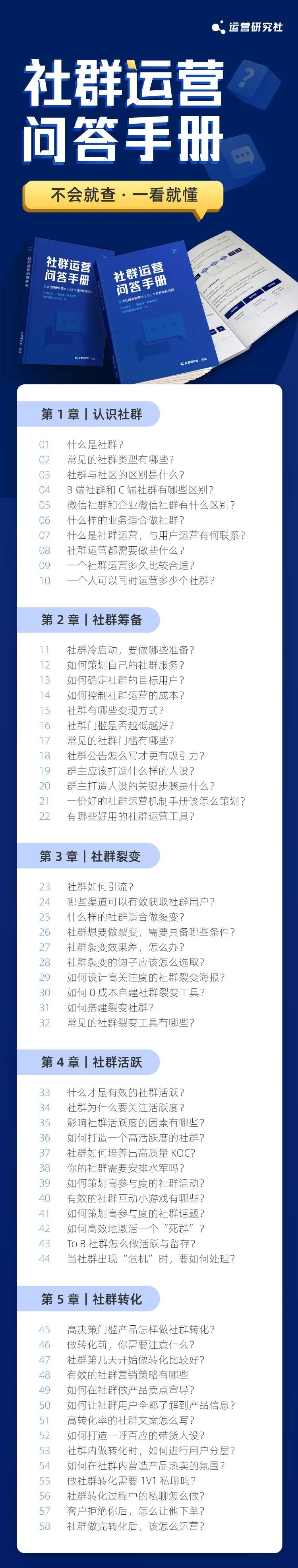 如果你还没入手这本手册,且刚好自己工作跟社群有关,亦或者对社群运营感兴趣。要不滑动目录看看,你或许也能发现不少对自己有用的内容。你的顿悟只是别人的基本功,如果目录里刚好你正在困惑的问题,这本手册你千万不要错过!课程售价 69 元, 现在购买可享受额外福利——免费包邮送 《社群运营问答手册》课程图文纸质版 1 份,心急的小伙伴直接扫码解锁课程(电子版)阅读起来。支付成功后,请根据自动弹出的二维码添加「运营宝宝」企业微信,根据提示填写对应问卷即可领取纸质版手册。此刻,如果你还在犹豫, 可以看看《社群运营问答手册》接下来的详细介绍吧。《社群运营问答手册》是运营研究社出品的第一份【问答式】知识产品。我们将它定位为企业社群和个人社群的运营操作手册,你在运营社群遇到困惑时,打开它就能获得方法的启发,甚至是看到可以直接复用的案例。手册内容覆盖认识社群、社群筹备、社群转化、社群活跃、社群裂变五大模块,帮助你解决运营社群中现在存在的,以及未来可能出现的困惑。一个人可以同时运营多少个社群?